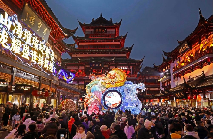 2024年1月21日,游客在豫园商城中心广场赏灯拍照。当日,2024上海豫园民俗艺术灯会正式亮灯。今年豫园灯会续写“山海奇豫记”,以“海经篇”为主题,生肖龙灯、海底世界、鱼群起舞、奇幻仙境等场景让游客在灯火绚烂的国风幻境中喜迎龙年新春。新华社记者 刘颖 摄