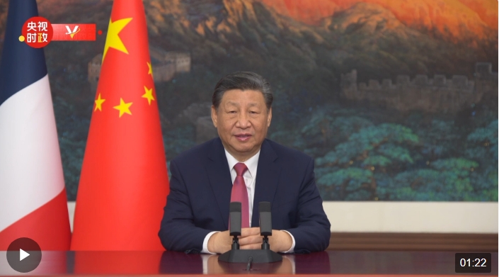 1月25日,中法建交60周年招待会在国家大剧院举行,国家主席习近平发表视频致辞。