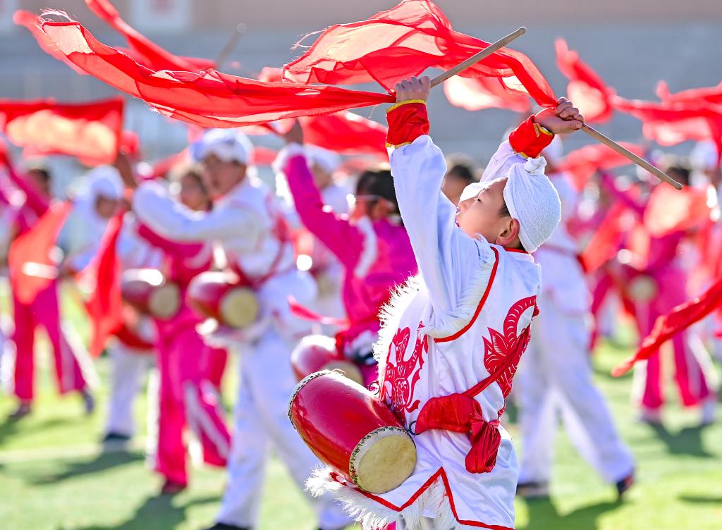 2023年11月16日,内蒙古鄂尔多斯市鄂托克前旗第二小学的学生在大课间表演安塞腰鼓。该校将安塞腰鼓列入学校的校本课程和大课间活动,聘请民间艺人传授技艺,让非遗文化在校园中传承。新华社发(王正摄)