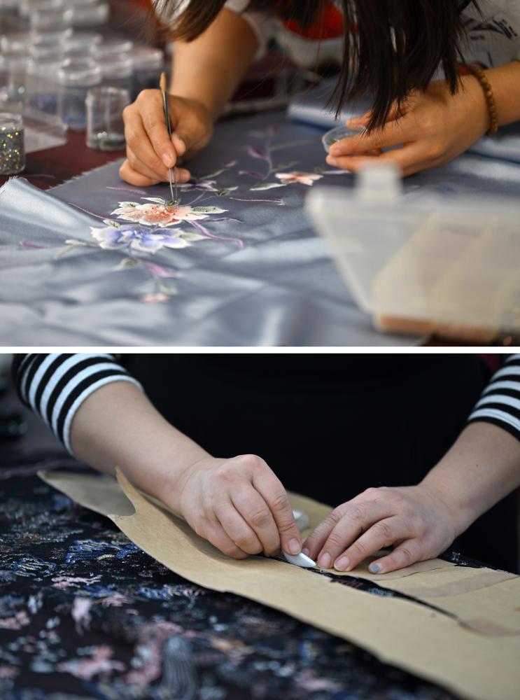 拼版照片:上图为老美华定制车间的制衣师傅在面料上贴钻;下图为老美华定制车间的制衣师傅在面料上划线(2023年12月8日摄)。天津老美华始创于1911年,历史上以“千层底”布鞋闻名,是享誉津门的“中华老字号”。新华社记者 李然 摄