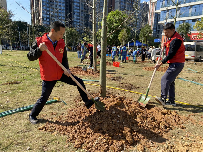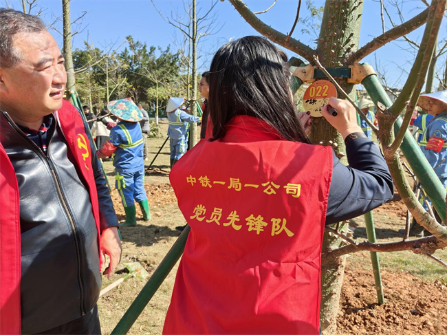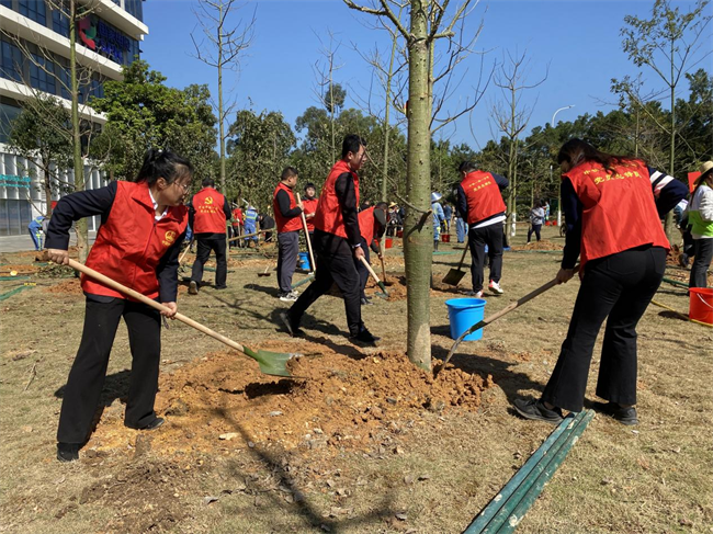 中铁一局一公司党委副书记、纪委书记朱怀勇带队,公司本部和番禺区在建项目的13名党员代表参加了本次活动,他们统一着装,手持铁锹、水桶等劳动工具,沐浴春日暖阳,满怀热情希望,认领了10棵象征着坚韧、勇气、智慧和兴旺的银杏和香樟,栽种下中铁一局一公司在广东番禺属地化发展的梦想和希望。