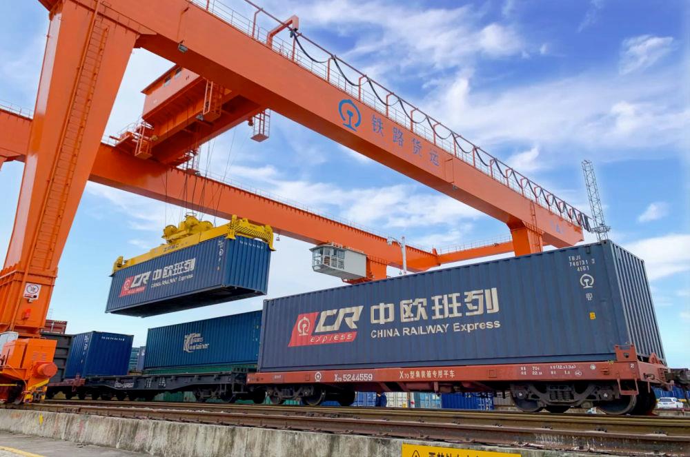 △2022年4月29日,在安徽合肥北站物流基地集装箱作业区,准备发运的中欧班列集装箱。