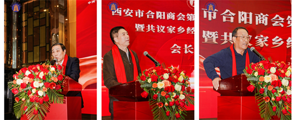 秦商总会执行会长刘阿津先生、西安市合阳商会名誉会长乔军先生、北京鸿基世业集团董事张志鸿先生作为来宾代表致辞。对新当选的商会领导班子成员表示祝贺,未来大家会一如既往地热爱关心合阳,宣传支持合阳,共同为建设美好家乡贡献力量。希望商会和各位乡友把个人发展与家乡发展紧密结合起来,带领大家积极走出去,把“先进技术”带回来、把“优质项目”落下来,为合阳的高质量发展赋能助力。