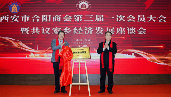 西安市合阳商会会长贾申龙先生与中国商业联合会副秘书长朱清平先生共同为西安市合阳商会新闻采访基地揭牌。