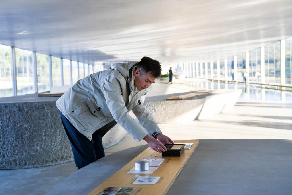 10月23日,在日照市五莲县白鹭湾小镇在水一方美术馆,刘茗轩在整理摆件。