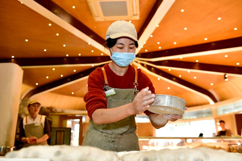 10月23日,在日照市五莲县白鹭湾小镇面包房,面包师舒熹在制作面包。