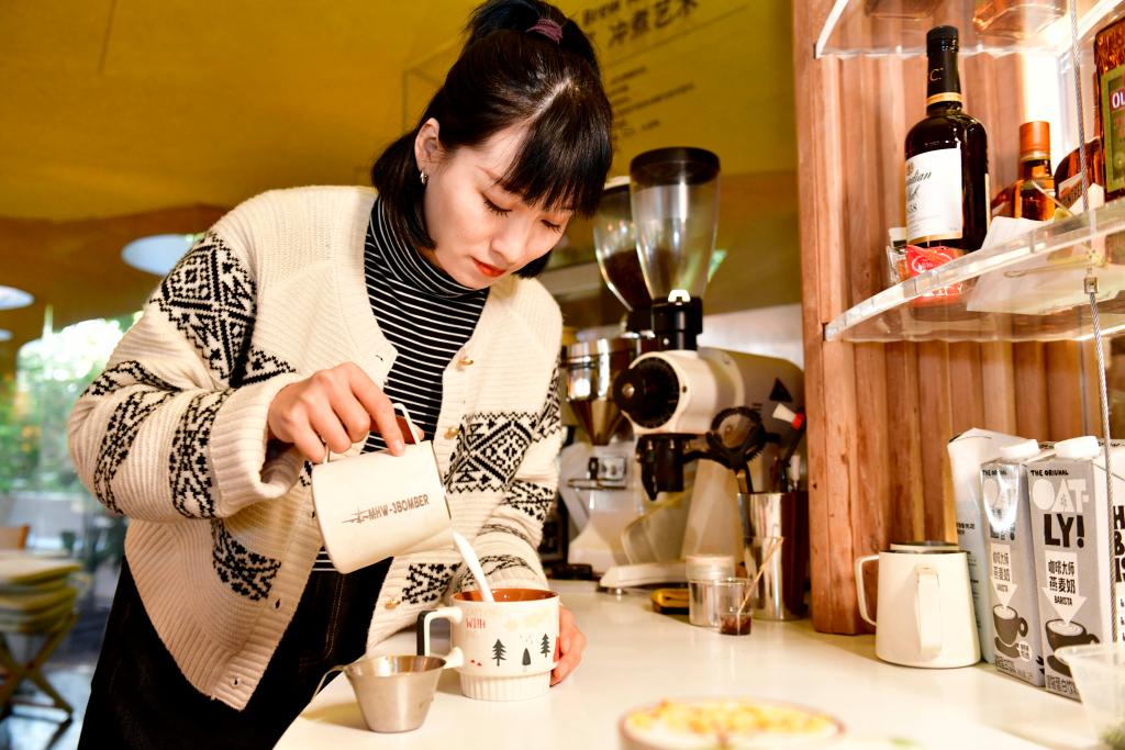 10月23日,在日照市五莲县白鹭湾小镇咖啡与树咖啡厅,咖啡师赵敏在制作咖啡。