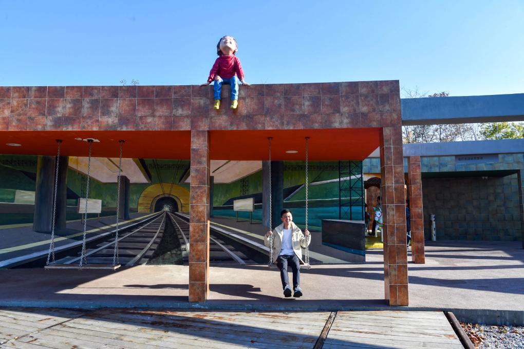 10月23日,在日照市五莲县白鹭湾小镇,刘茗轩在几米主题乐园休息。