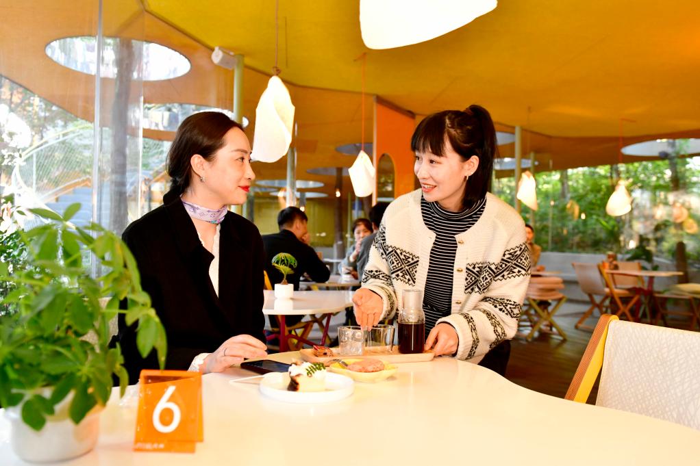 10月23日,在日照市五莲县白鹭湾小镇咖啡与树咖啡厅,咖啡师赵敏为客人端来茶点。