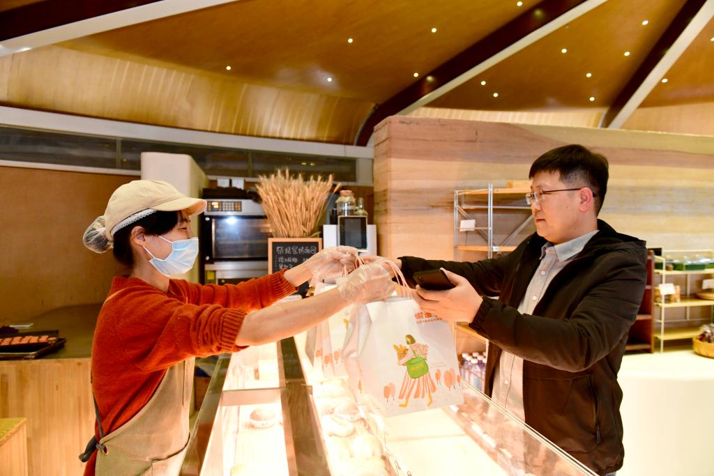 10月23日,在日照市五莲县白鹭湾小镇面包房,面包师舒熹(左)将包装好的面包递给客人。