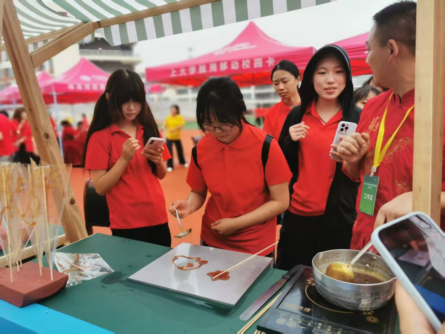 活动现场,科学健身科普展、健身打卡挑战赛、中医运动集市及“体育+非遗”文旅项目体验早早排起了长龙。尤其是中医推拿、艾灸理疗、应急救护技术展示,以及当地糖画、蛋雕、剪纸、竹编灯笼等非遗传承人现场展示,成为一大亮点,成功打造了“体育+卫生+文旅”融合新场景。同学们一边欣赏传统技艺的精妙,一边动手参与,在指尖与创意的互动中感受传统文化的魅力。“第一次在校园里看到非遗和体育结合,感觉特别新鲜!”正在体验糖画制作的大一学生胡雅楠兴奋地说。