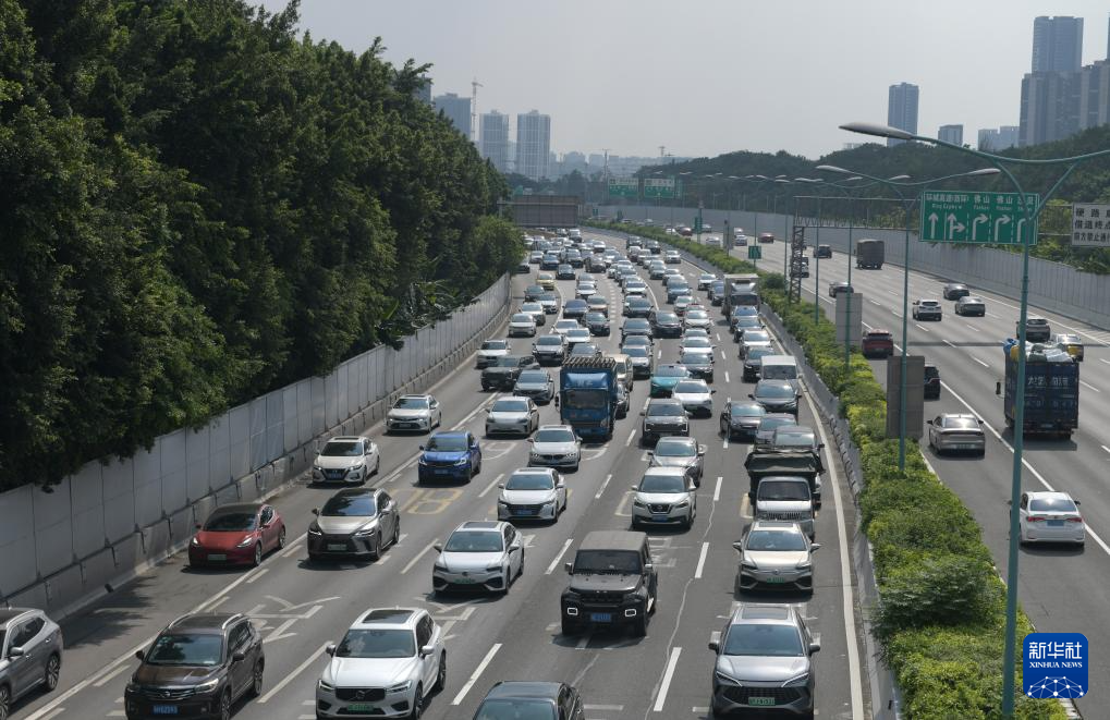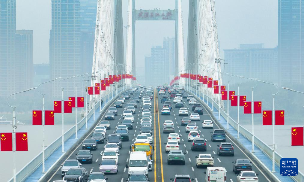 10月1日,车辆行驶在湖北省武汉长江二桥上(无人机照片)。