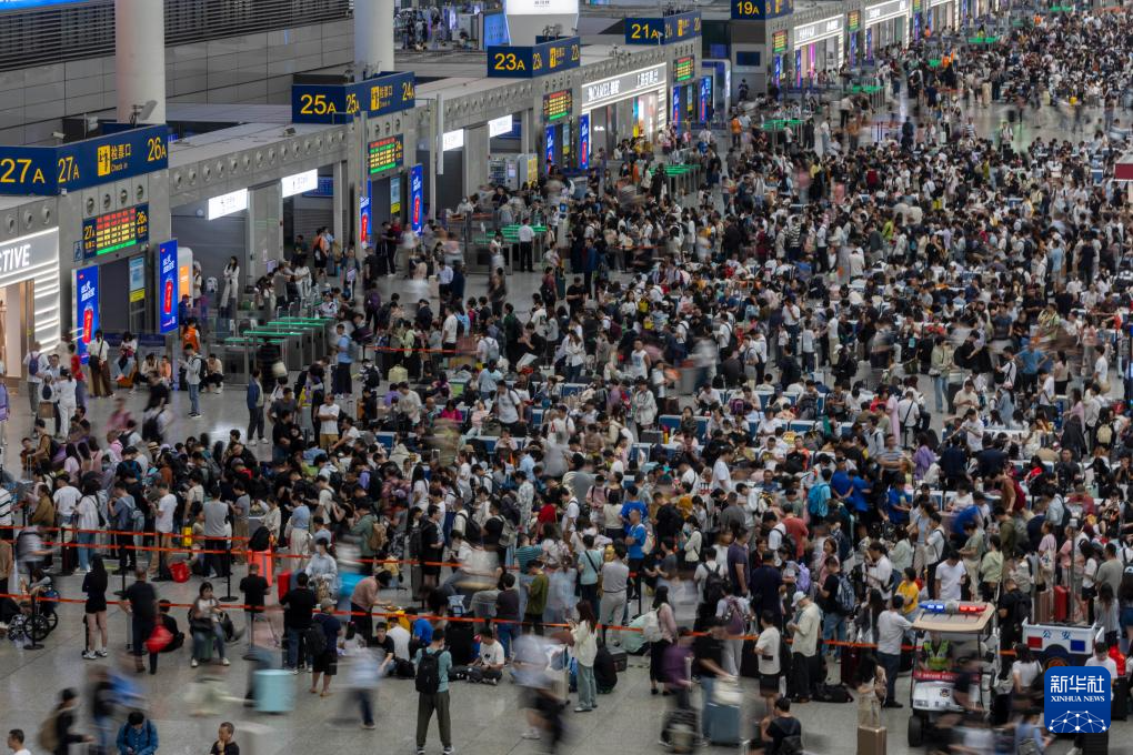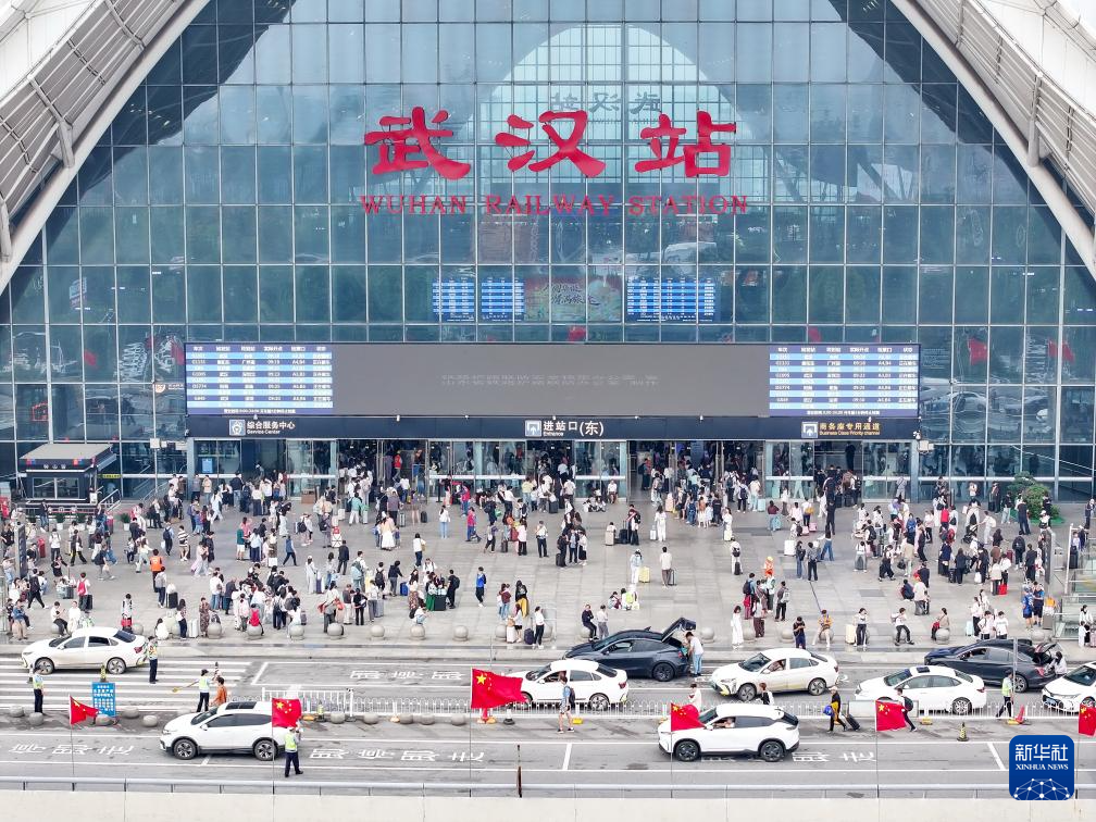10月1日,旅客在湖北省武汉站东广场进站口准备乘车出行(无人机照片)。