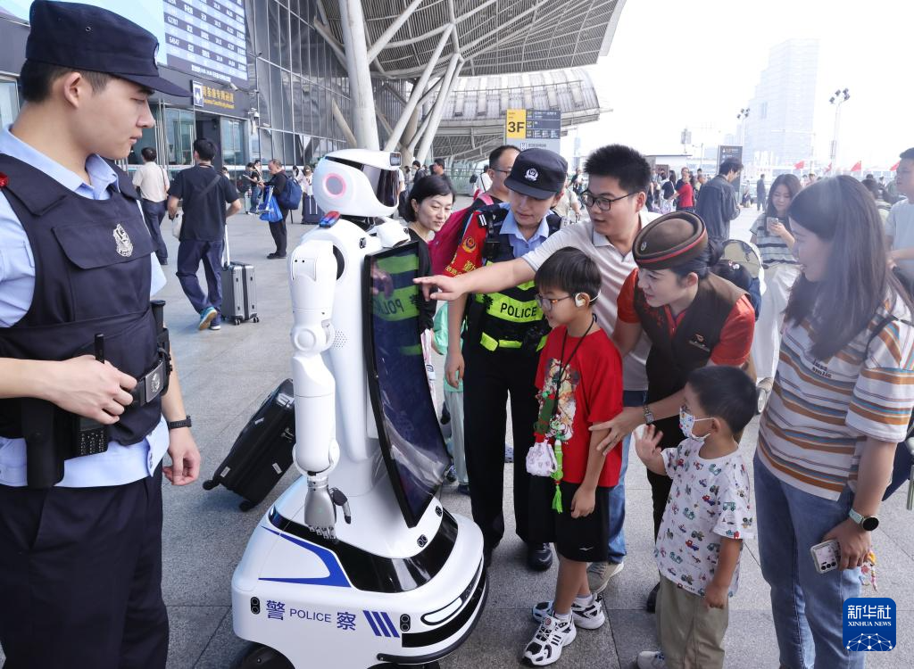 10月1日,在湖北省武汉站,小朋友和机器人互动。