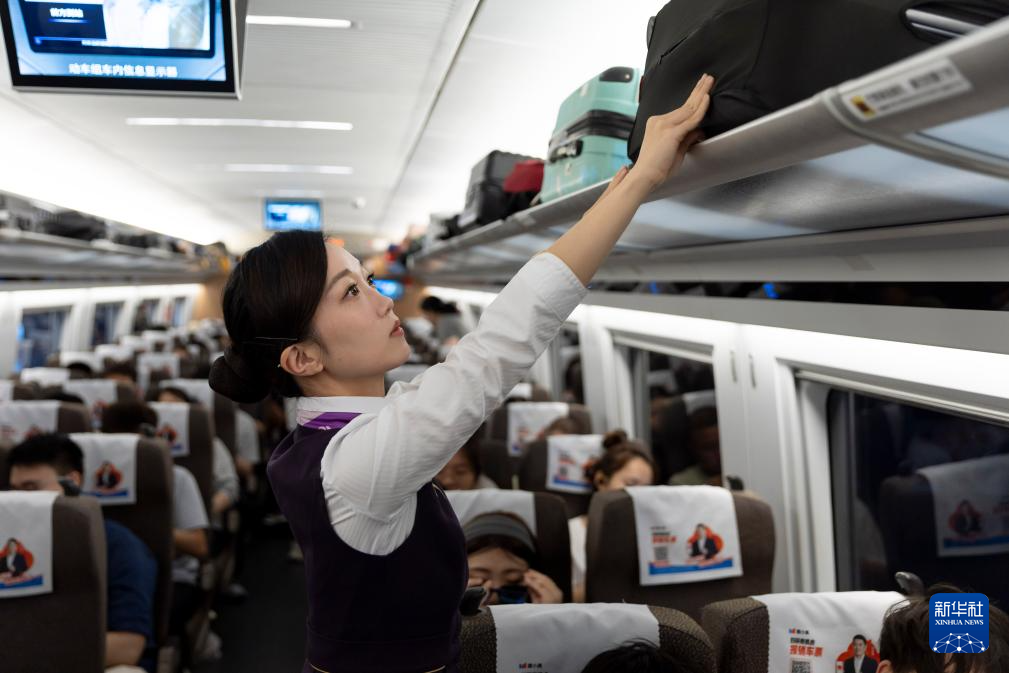 10月1日,铁路上海客运段乘务员为旅客整理行李架。