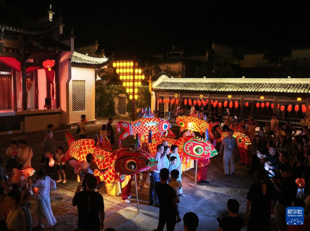 10月1日晚,在安徽省黄山市黟县秀里古村,游客与鱼灯合影(无人机照片)。