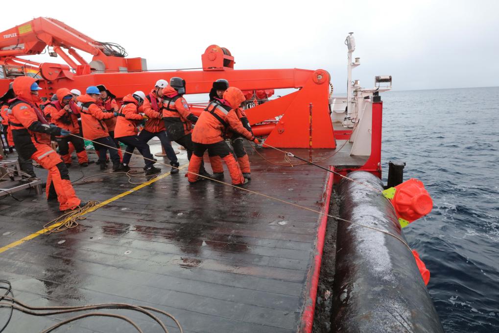 队员们在艉甲板回收Lander。新华社记者刘诗平 摄