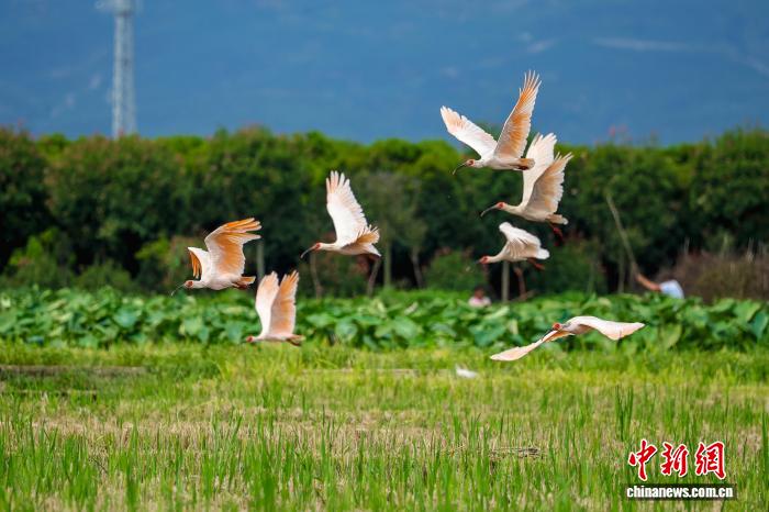 朱鹮成群飞过陕西汉中的稻田。李吉安 摄