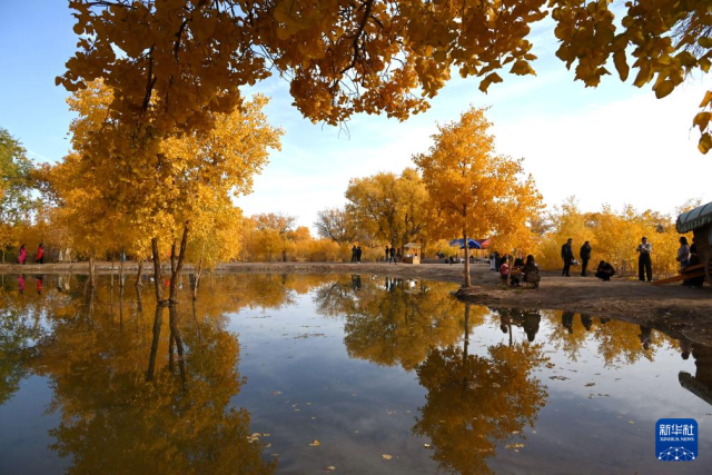 金秋十月,甘肃敦煌多地胡杨林被秋色渲染,吸引游客前来赏景打卡拍照。