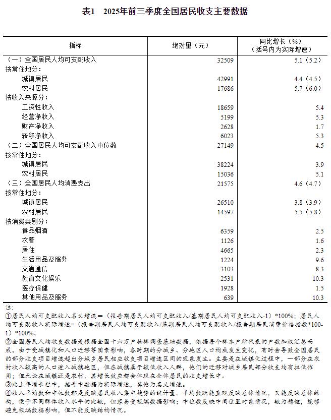 据国家统计局网站消息,国家统计局20日公布2025年前三季度居民收入和消费支出情况。
