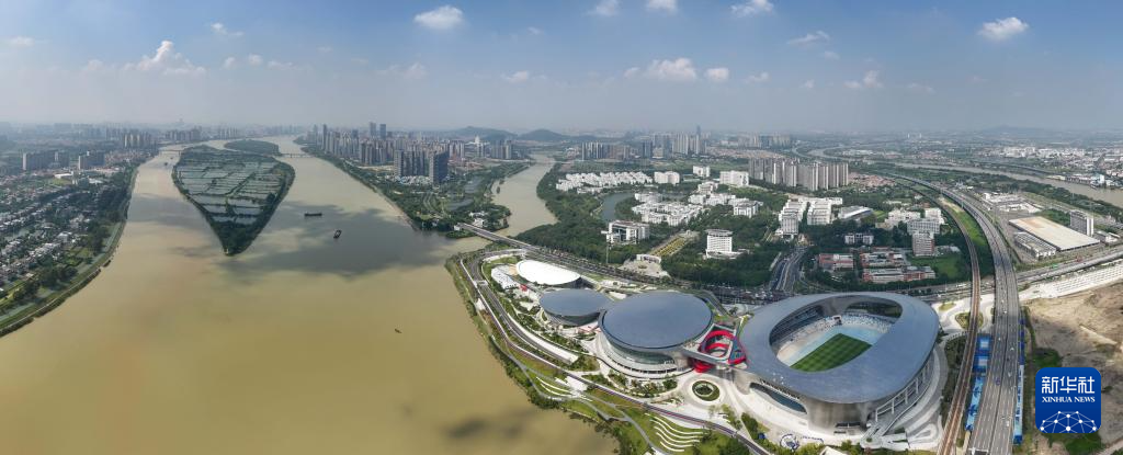 广东佛山顺德德胜体育中心部分景观(10月18日摄,无人机照片)。全运会足球女子成年组、篮球女子成年组比赛在这里举行。新华社记者 邓华 摄