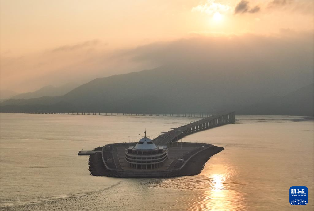 晨曦中的港珠澳大桥和蓝海豚岛(10月19日摄,无人机照片)。港珠澳大桥是全运会公路自行车项目途经地,一桥串联粤港澳三地。新华社记者 毛思倩 摄