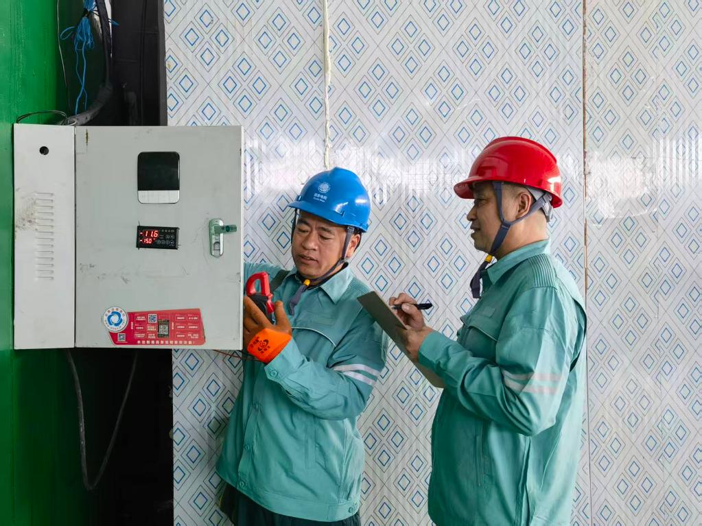 供电公司工作人员正在检查柿子加工企业的冷库用电设备。新华社发(高航政 摄)