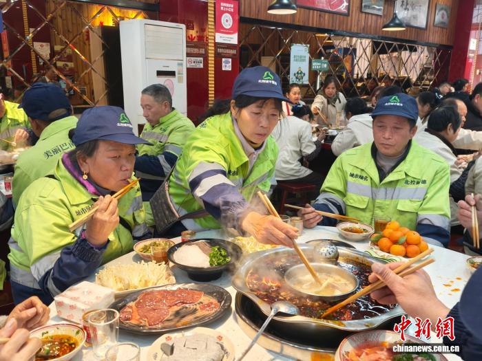 位于巴南区花溪街道民主新街的宏茂火锅店,10日11时便已是一派热闹景象,50位环卫工人与社区孤寡老人受邀赴宴。店门口“欢迎回家吃团年饭”的红色横幅格外醒目,滚烫的红油火锅沸腾翻滚,寓意日子红红火火,丰富的菜品摆满餐桌,藏着生活美满的美好期许。除了共享火锅盛宴,现场还准备了趣味小游戏与暖心礼品,声声“新年快乐”的祝福里,满载着新春的热闹与温情。