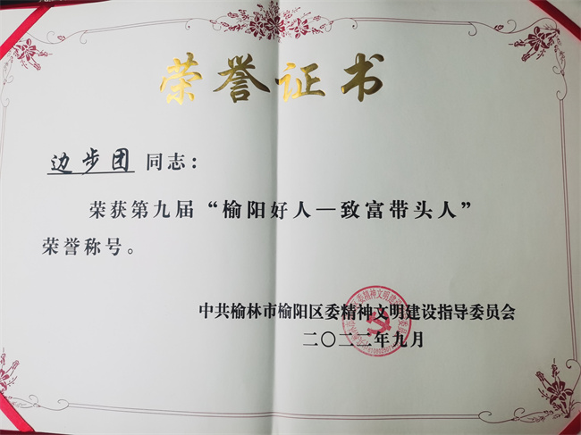 任职7年来,油房湾村的村民通过产业实现了共同富裕。边步团也因此先后获得了“2021年度榆阳区巩固拓展脱贫攻坚成果同乡村振兴有效衔接工作先进个人”、“榆阳区担当作为好书记”、“榆阳好人—致富带头人”等荣誉称号。