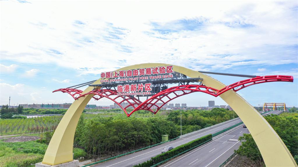 位于上海浦东新区S2沪芦高速公路上的中国(上海)自由贸易试验区标志门。(无人机照片,新华社记者方喆摄)