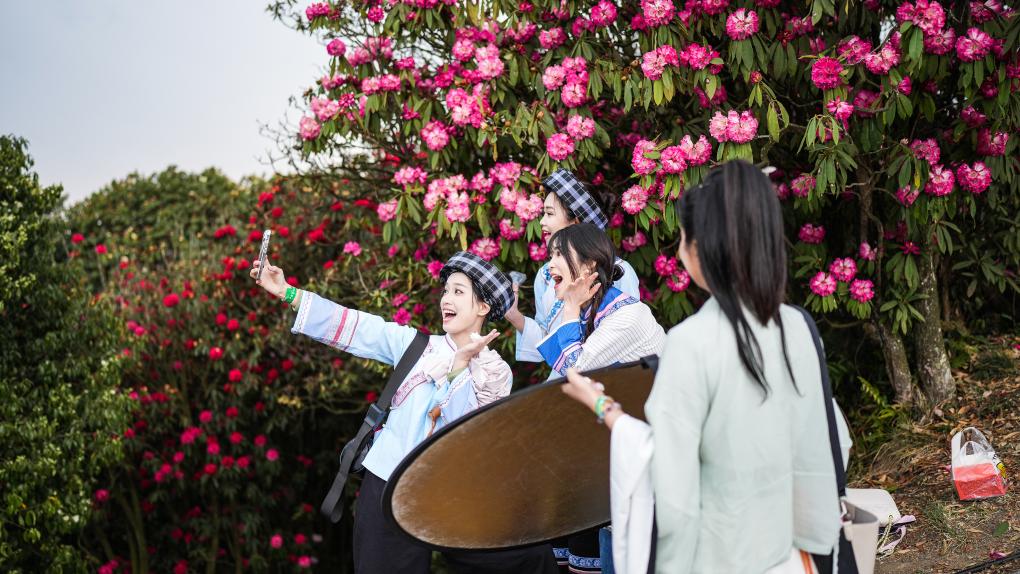 游客在百里杜鹃金坡景区合影留念